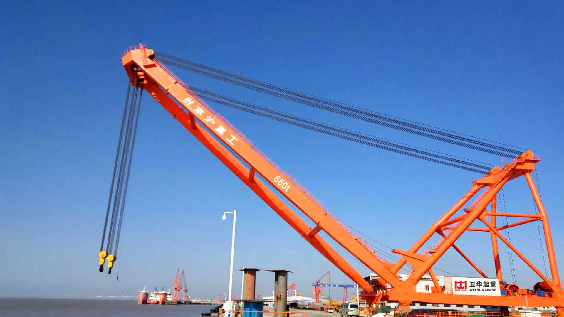 该起重机用于京沪重工码头,主要承担码头吊运22000m³LPG液罐。两吊钩抬吊起重量可达660吨,变幅幅度21.5-54m。